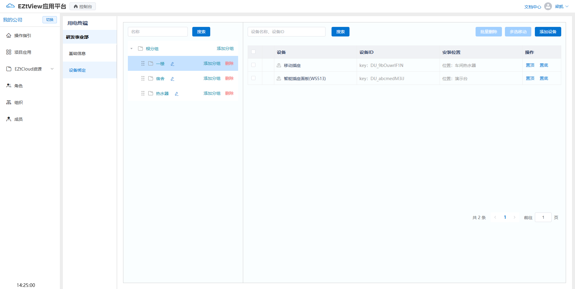 在一个EZTView项目中,可能有多个组织,不同组织需要关注的设备不同,所以需要将设备添加到组织里,一个设备只能属于一个组织,点击“设备”按钮进入组织设备添加页。