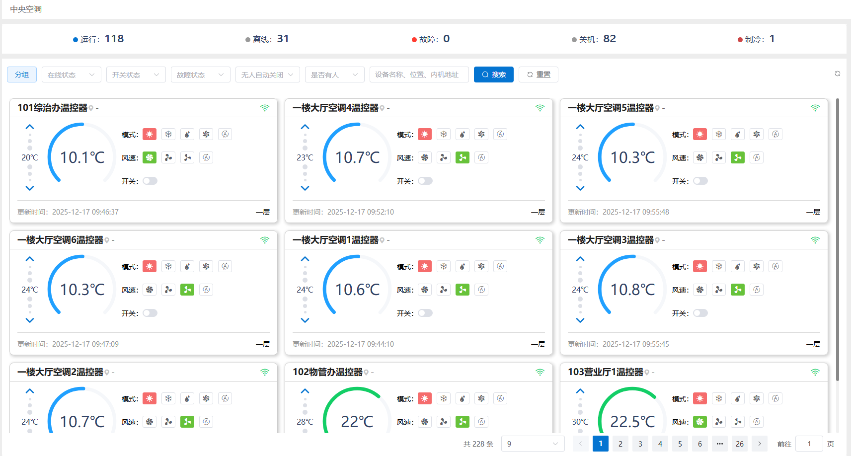 中央空调应用用于监控智能空调控制设备,如智能温控器、空调网关等。中央空调应用具备的功能如下:
