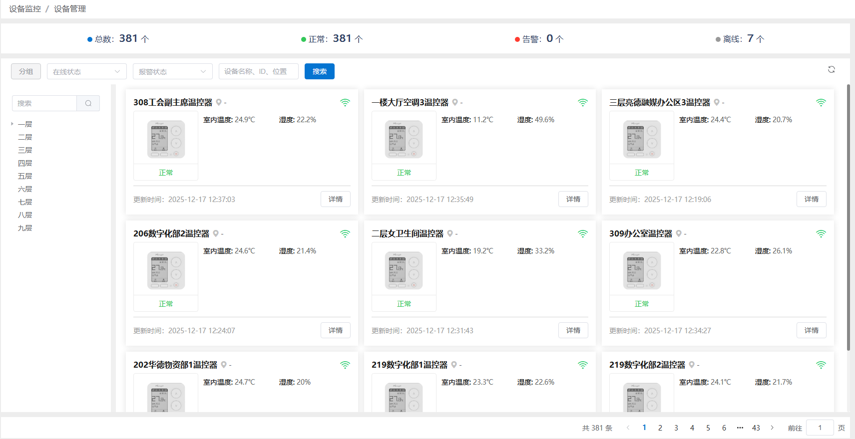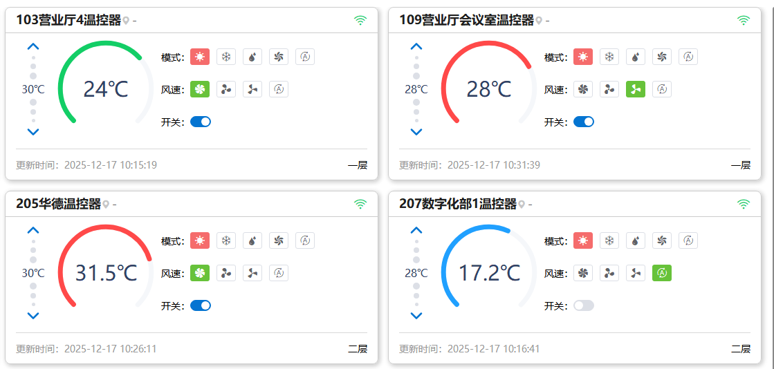 • 设备在线离线:卡片中"WiFi"图标绿色在线,灰色离线