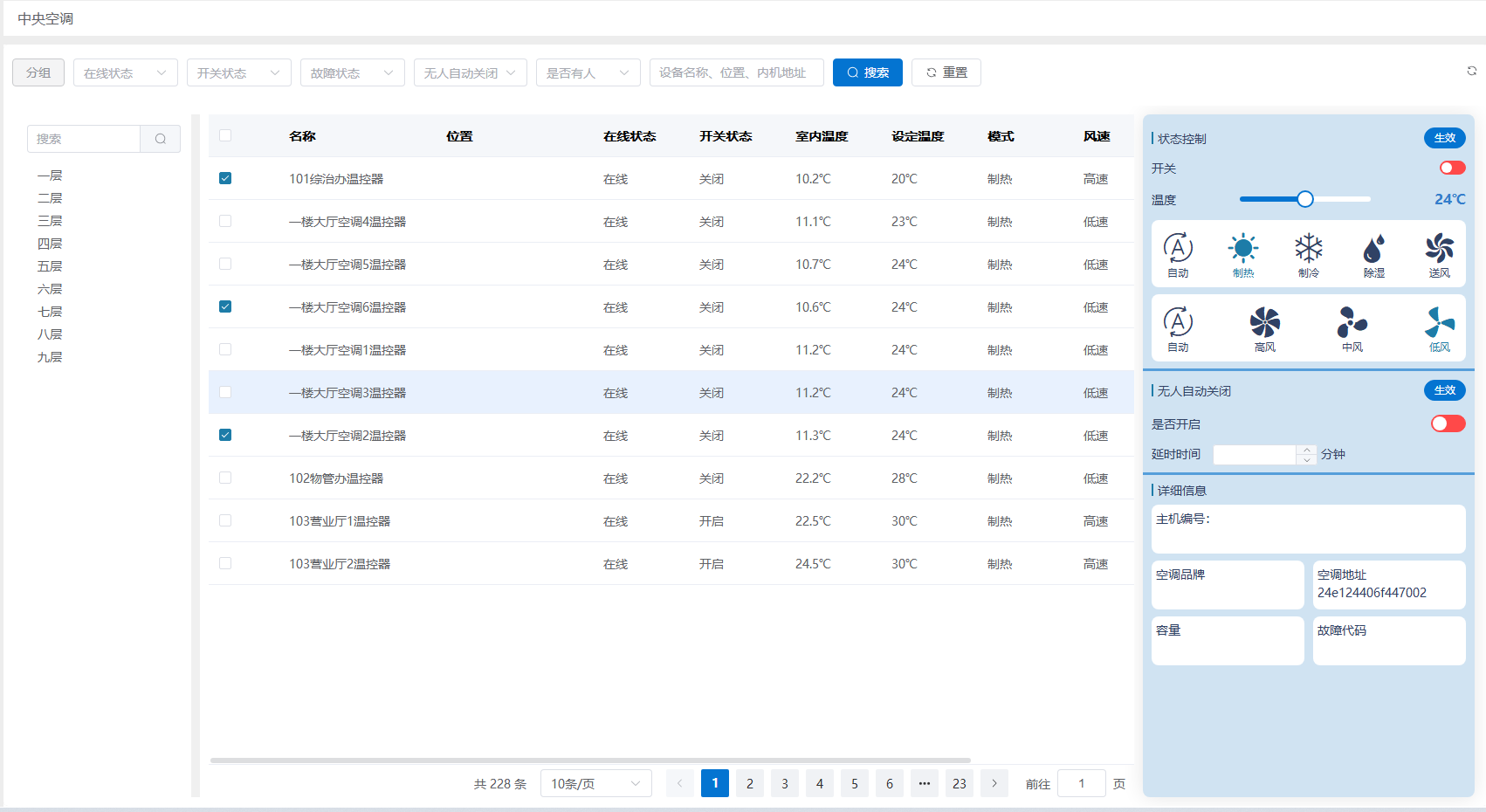 中央空调应用具备批量控制功能,进入“批量控制”菜单,先选中列表中的设备,再预置设备状态,最后点击"生效"按钮