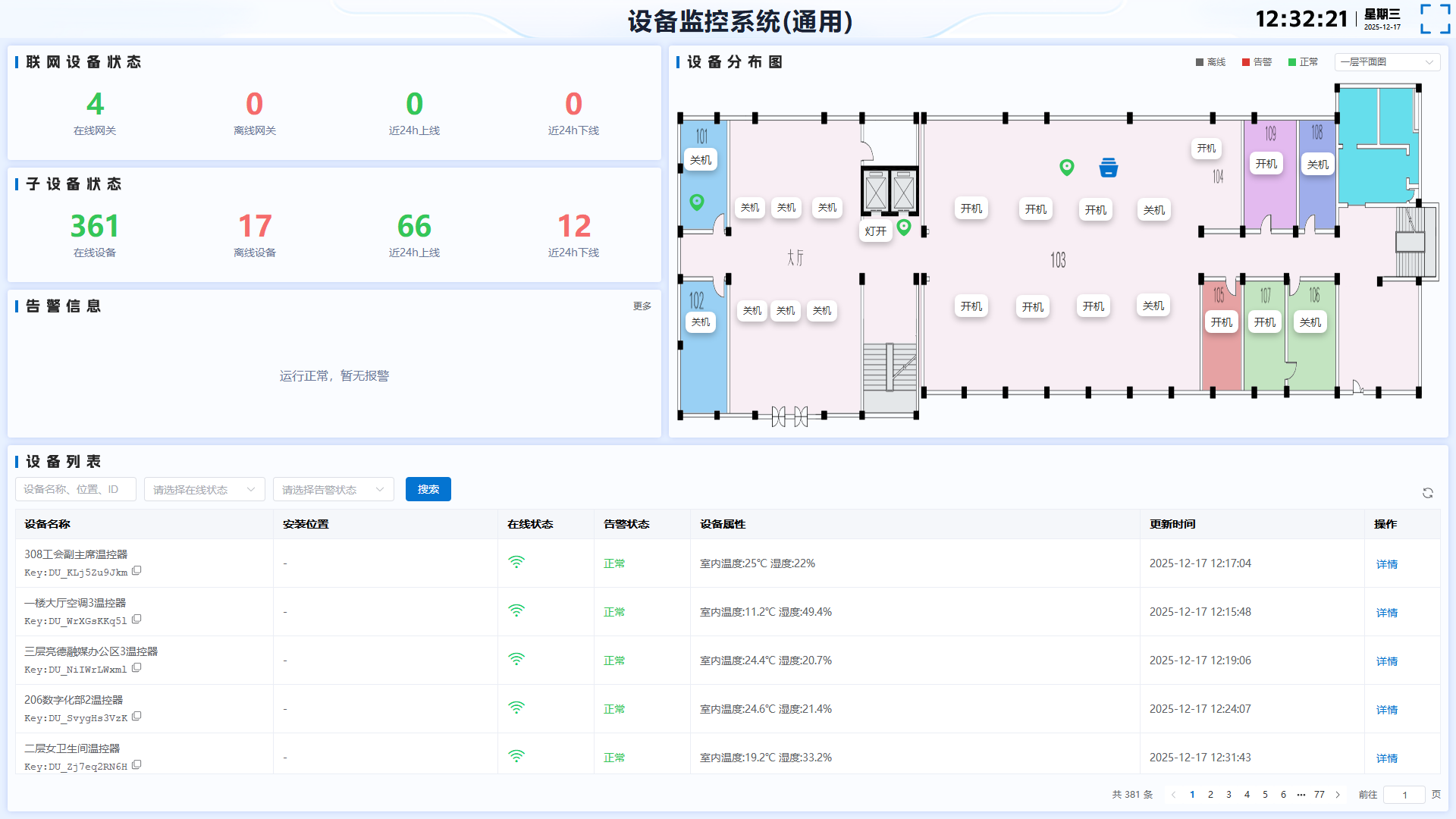 • 统计设备数量:设备总数、正常设备数量、告警设备数量、离线设备数量