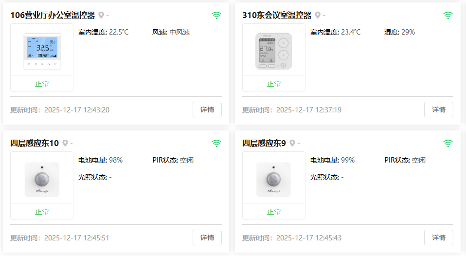 • 数据展示:卡片内只展示设备上报的数据,如需控制,点击"详情"按钮
