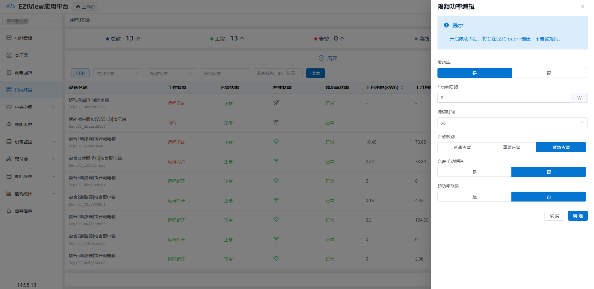 • 视图切换:设备卡片视图和列表视图,在列表视图可以配置限额功率