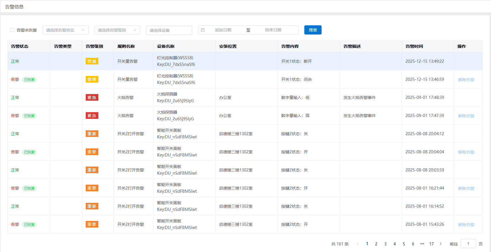 告警信息是必选应用,展示所有设备的告警状态变化记录。告警状态有告警、告警待定、正常。如果一条告警由告警态恢复为正常态,会产生一条正常记录,同时告警记录会显示“已恢复”标签